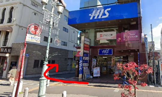すると、右側にHISがあるので、そこを右へ曲がり直進します!