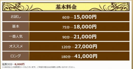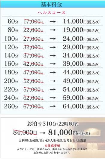 コースは割り引きありで100分2,7000→2,4000円+指名料2,000でした。