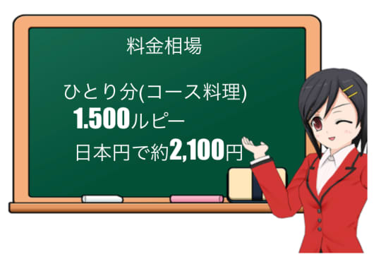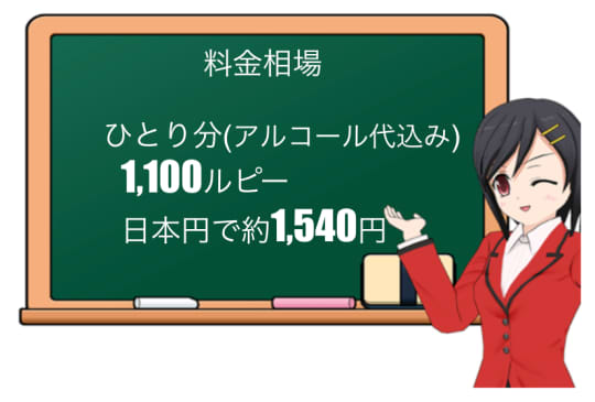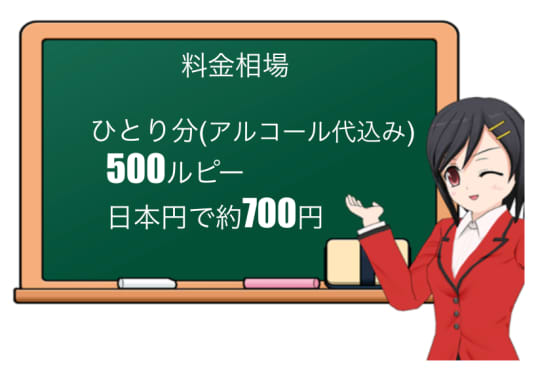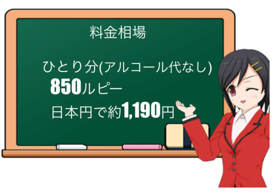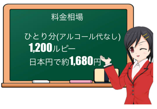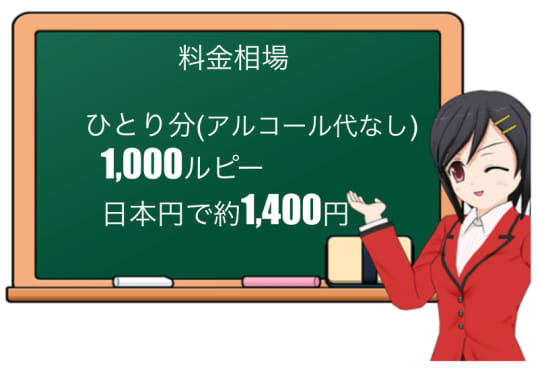 二人での予算はアルコールなしで2,000ルピー(2,800円)ほどですが次の料金を参照してください。
