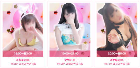 20歳前後の若い子がメインのお店。写真は一例だけど、全体的にロリ系かつ巨乳の子が多く在籍してる感じかな。僕のようなオジサンには最高のデリヘルだ!