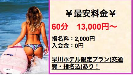 プレイ料金は60分13,000円とお得な感じ。指名料2,000円が別にかかりますが、都心に比べたら結構安い。特定のホテルへ派遣だと交通費が無料になるプランあり。詳しくは電話で聞いてみて。