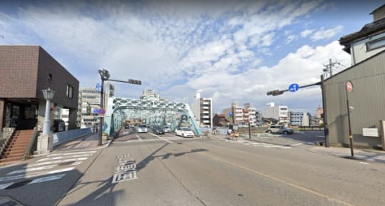 蝶の建物から右に行くと、「犀川大橋南詰(さいがわおおはしみなみづめ)」の水色の橋があるから、いい目印になるかもね。