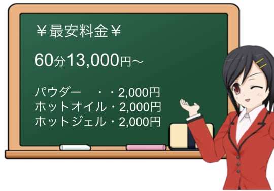 料金 | 60分13,000円~ | 90分16,000円~ | 100分20,000円~ | 90分16,000円~ | (新規)60分ん9,000円~ |