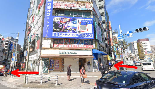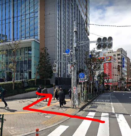 駅を出てすぐ目の前の横断歩道を渡り、さらにすぐ左側の横断歩道を渡ってくださいね。