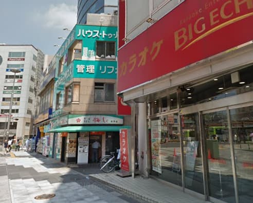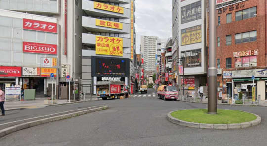 ロータリーの向こうに「BIG ECHO」というカラオケ店があるので、そっちに向かって進んでね。