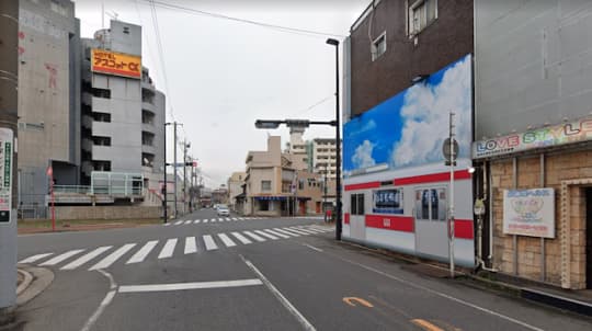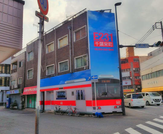 右側に電車のイラストが描かれているビルが店舗。
