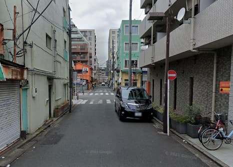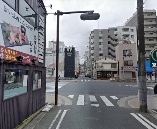 そのビルを曲がってまっすぐ行きます。すると焼き肉屋が見えてくると思うので、その前の信号を渡ります。