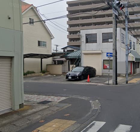 右に曲がると、ピンクの建物が見えるよ。そこが令和商事の建物だ。