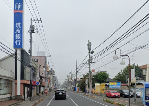 右に曲がったらそのまままっすぐ進むよ。途中で筑波銀行の前を通るよ。
