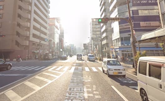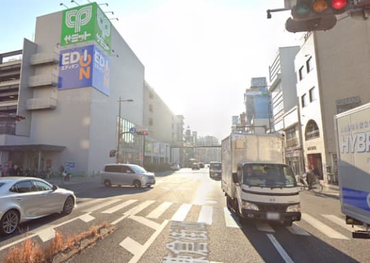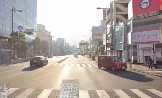 そこを出ると、こういった交差点に出ます。目の前にローソンがあるので、その信号をまっすぐに進んでください。