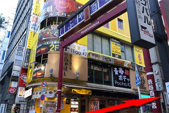 右手に109の建物が見える状態から少し進みますと、右手にしぶや百軒店のアーケードが見えてくるので、そちらを右手に曲がって下さい。