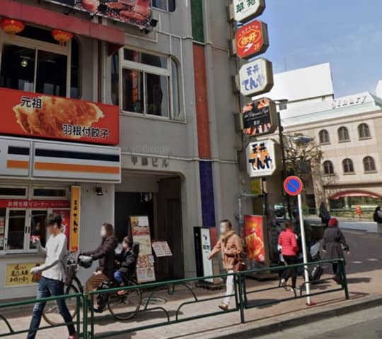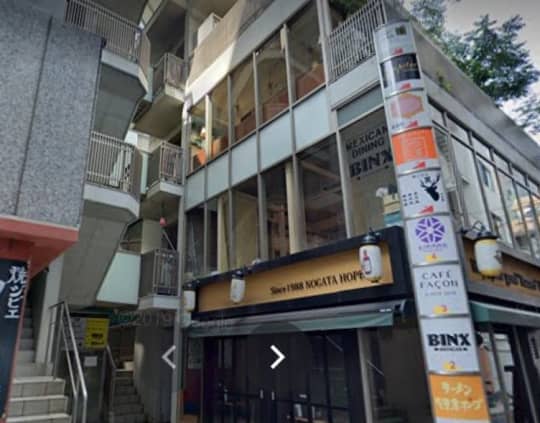 左手にある飲食店や風俗が入っている「甲羅ビル」のB1階に店舗がある。