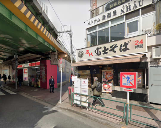 ③ガードを越したら、左折してココカラファインと富士そばの間の道を進む。