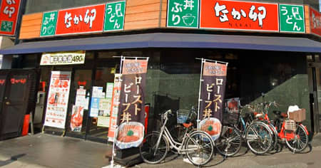前方の横断歩道を渡れば左手に、左側の横断歩道を渡れば前方に『なか卯』の前に出る横断歩道があるのでそこを渡ろう。