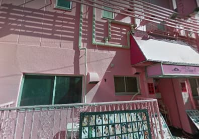 右側にピンク色の建物がみえたら、そこがニューティアラです。