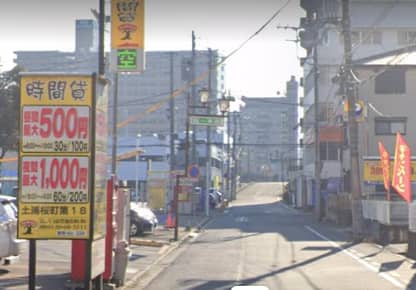 大きな交差点を渡りまっすぐに進むと、左手に有料駐車場が見えます。