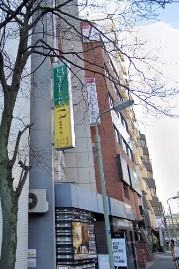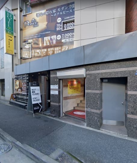 HOTEL Mint(ホテルミント)とHOTEL Peace(ホテルピース)の看板があるビルが見える。