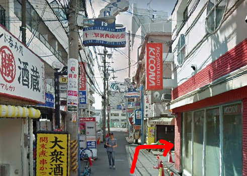 十三駅前商店街を歩くと、赤い建物のパチンコ&スロットがあるので、そこを右へ曲がり直進です!
