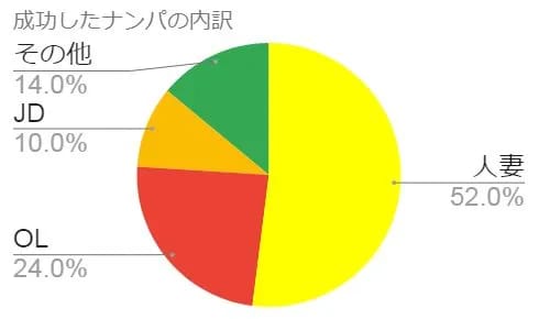 ナンパ全成功の中で人妻の割合が5割越え。人妻がJDやOLに比べてどれほど落としやすいかってこと。