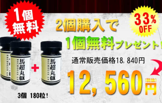 馬超丸GXは2個購入すると1個無料、さらに3個購入すると2個無料でプレゼントがもらえる太っ腹企画を実施中です。