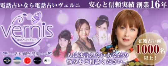 国内最大級の電話占いの老舗ヴェルニは、16年の歴史を持つ人気の占いの館です。誰にも言えない不安な悩みを経験豊富な占い師たちが的確に鑑定し、アドバイスをしてくれます。