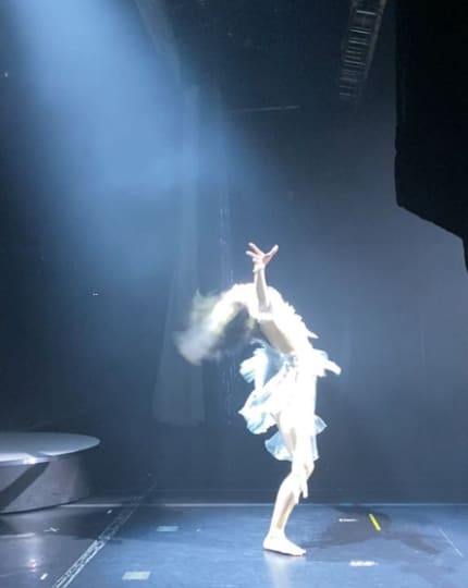 津軽三味線の和太鼓のリズムに合わせながら、3人は3度交差します!男性への嫉妬をテーマにしているのでしょうか?3人はお互いの着物をやや強引に剥ぎ取ります!矢沢ようこは、帯を剥ぎ取られくるくると回りながら、舞台中央に座り込みます。