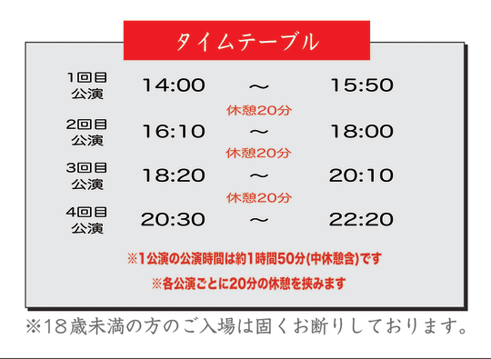 営業時間:開場 : 13:00 開演 : 14:00 終演 : 22:20